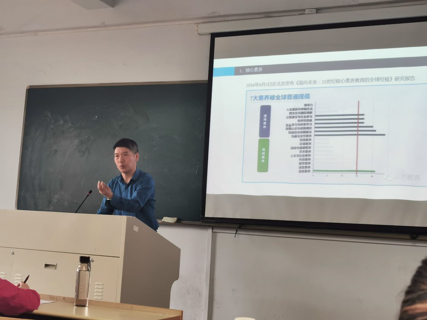 毛刚飞老师首先从核心素养及其特征讲起,指出核心素养是最关键、最必要的共同素养,是知识、技能和态度的综合表现。接着,毛老师展示了“被全球普遍提倡的7大素养”的通用素养,阐明培养具有创新意识和批判思维、公民责任与社会参与等素养的人才已成为各国教育改革关注的要点,毛老师又在美国核心素养“6c”和中国核心素养的概念和课文案例对比中,点明目前人文学科和科学学科的区别和联系。