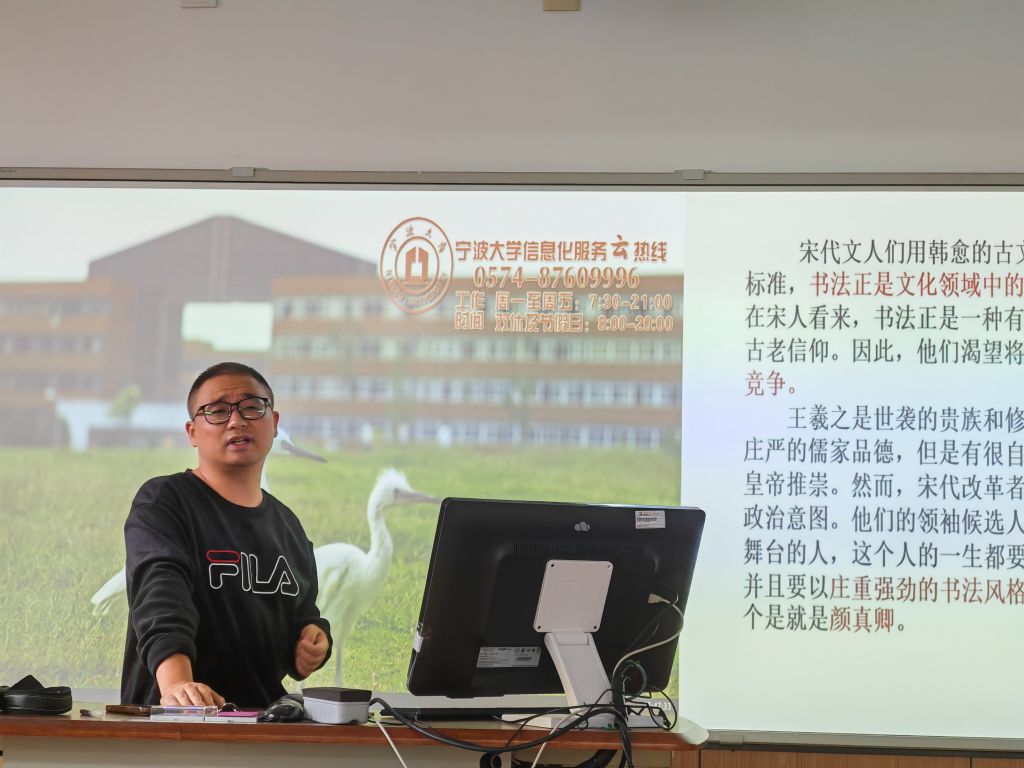 程景牧老师讲求课堂互动性与趣味感,以颜真卿书法作品“美不美”的话题导入,激发学生兴趣,进一步论及“书品”与“人品”的对应关系。课堂引用例证丰富,程老师古谈颜真卿、王羲之、欧阳修等书法大家的惯用笔法与后人评价,引申讲述乾嘉学派、章黄学派等思想;今论中美学者文学批评的异同,解读古今中外观点并加以评述,帮助学生拓展视野,有层次、有对比地理解不同时代文化背景下的文学批评内涵。