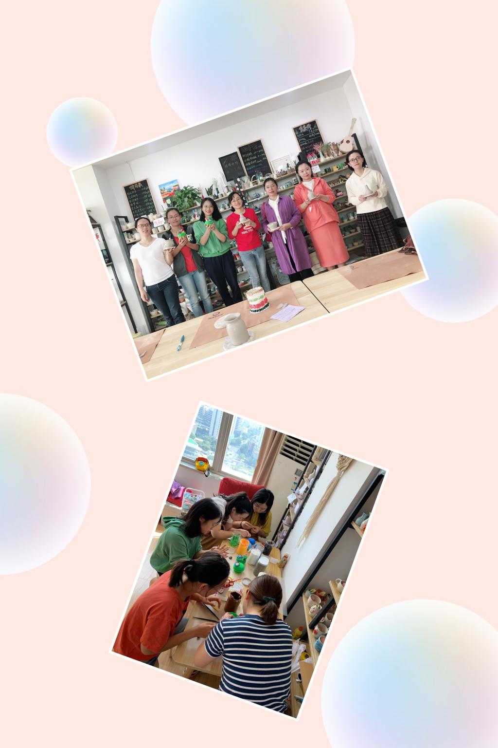 活动中,陶艺老师讲解了陶艺品制作方法以及注意事项,并现场演示了陶艺制作过程。老师们根据陶艺老师所讲的的技巧方法亲自动手制作小陶器,有花瓶、有碗、还有盘子等等,并体验了转盘拉胚和音乐盒制作。