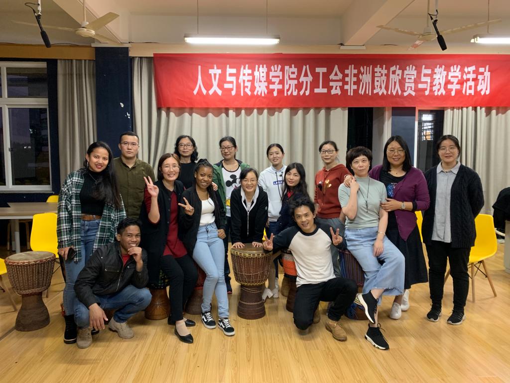 此外人文与传媒学院来自马达加斯加的三位留学生也来参与助兴,一场非洲鼓的欣赏与教学活动让老师们在笑声和鼓声里舒缓了疲惫、放松了精神,在笑声与鼓声中好像做了一场精神spa。同时,本活动也增强了师生感情,加强了国际间的文化交流。