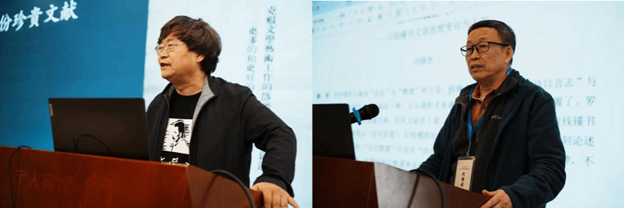 大会的主题报告环节,由《探索与争鸣》屠毅力博士主持,共有八位专家学者先后发言。上海交通大学夏中义教授围绕“从古籍到今典的版本学”,对《中国诗与中国画》“修订”本、《管锥编》“增订”本、《宋诗选注》“拟残”本进行心因解码,从而探讨钱著版本的演化问题。南京大学赵宪章教授则从“书写艺术非摹仿”“语象被比象成就书像”“文学书像论新场域”三方面,指出文学书像不同于画像等一般文学图像,并不是对物的直接摹仿,而是一种特别的书写比象。