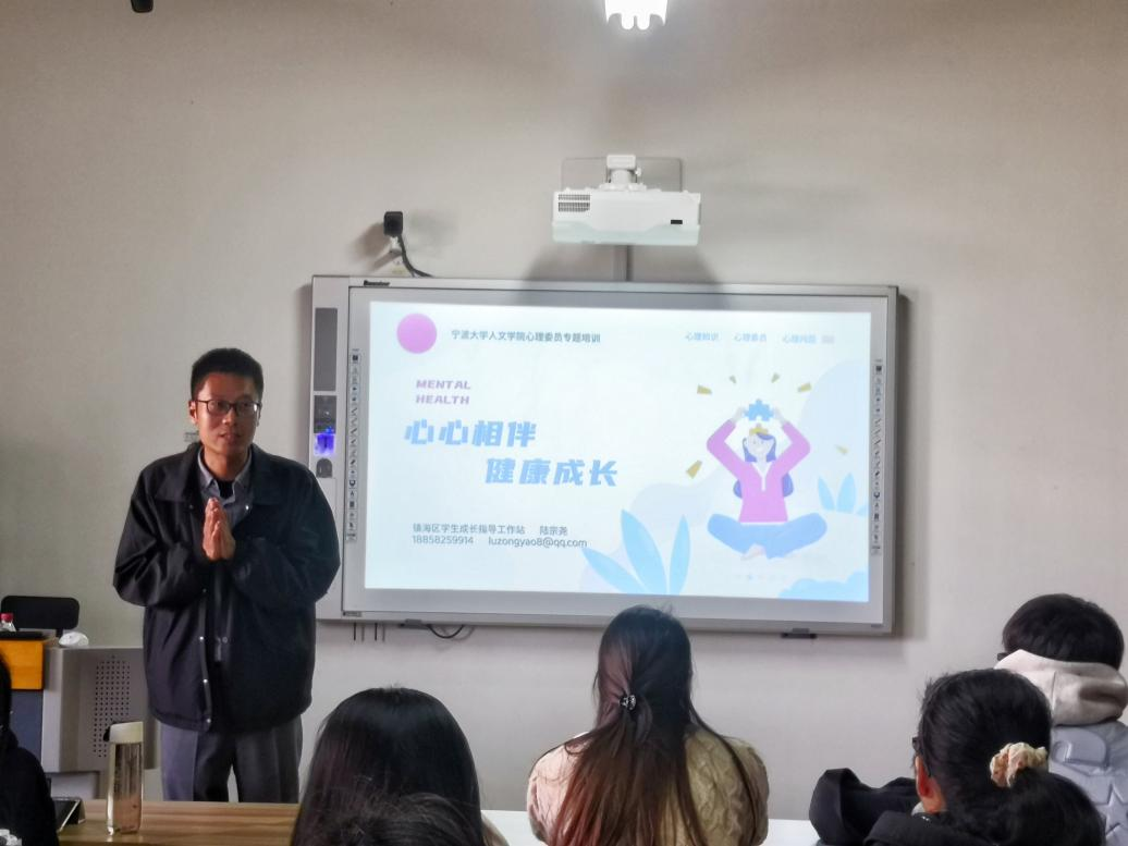 为更好地提升心理委员的工作能力,普及心理健康知识,发挥心理委员在班级中的积极作用,提高朋辈心理自助、互助的意识和能力,2023年11月21日中午,人文与传媒学院邀请镇海职教中心副校长、镇海区学生成长指导工作站首席导师、宁波大学心理系兼职硕士生导师陆宗尧为学院全体心理委员做“心心相伴 健康成长”的主题讲座。学院党委副书记孙文静、学工办主任李洪伟一同出席。