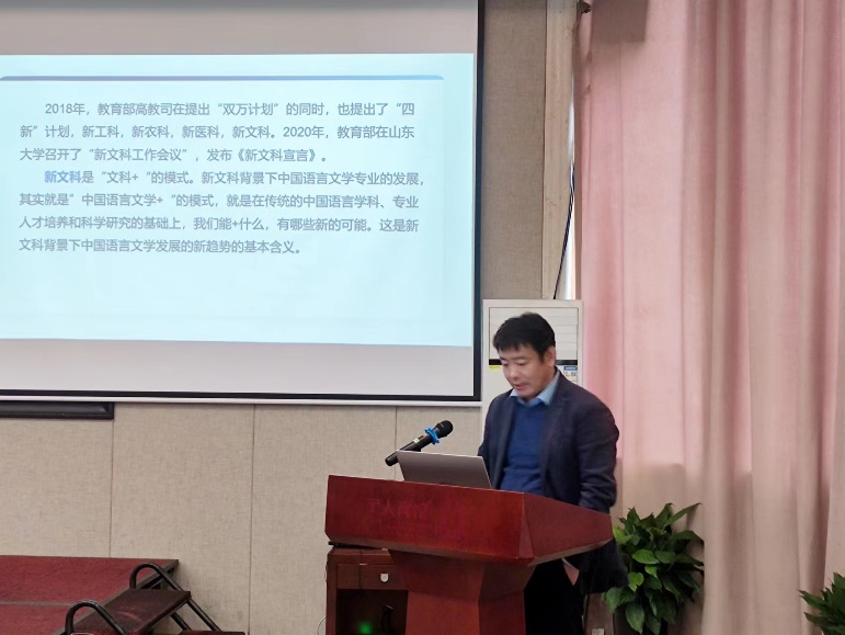 主旨报告环节,宁大中文系聂仁发教授首先从专业人数、师资力量、学科建设、发展愿景等四个角度向诸位专家介绍了宁波大学中文学科的建设状况,以及全院师生建设好一流中文学科的决心和信心。