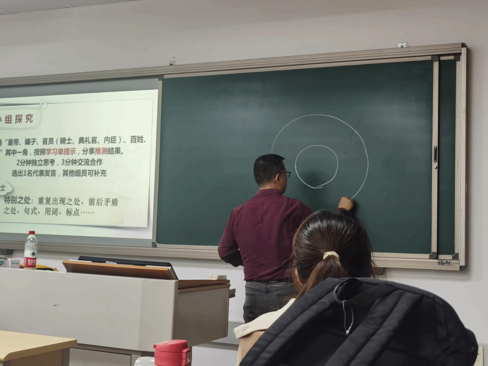 为帮助同学们深入理解任务群教案评析的教学方法,任老师以“疏理与探究任务群”为例,就“客愁诗”进行教学设计展示,层层递进并总结出“筛选梳理、统计梳理、比较探究、联结深思”的梳理与探究方法,这对于锻炼学生体悟能力、迁移能力、建构能力都具备重要意义。就视觉化策略在教学中的运用,任老师通过《天净沙·秋思》《邹忌讽齐王纳谏》《登幽州台歌》三篇课文的解读,明确指出教师可以借助跨学科直观几何(画变化曲线、坐标图、表格)、绘制可视化图像、引导学生联想等方式来帮助学生科学高效地探求知识、感知情感。而在“‘三位一体’的单元统整”这一策略分析中,任老师强调了教师示范的重要性:教师可运用单元教学相关概念开展示范教学,并引导学生模仿教师开展通过独立思考、小组探究的形式,在举一反三的过程中总结同类文章的阅读分析策略,从而实现单元文章教学串联。