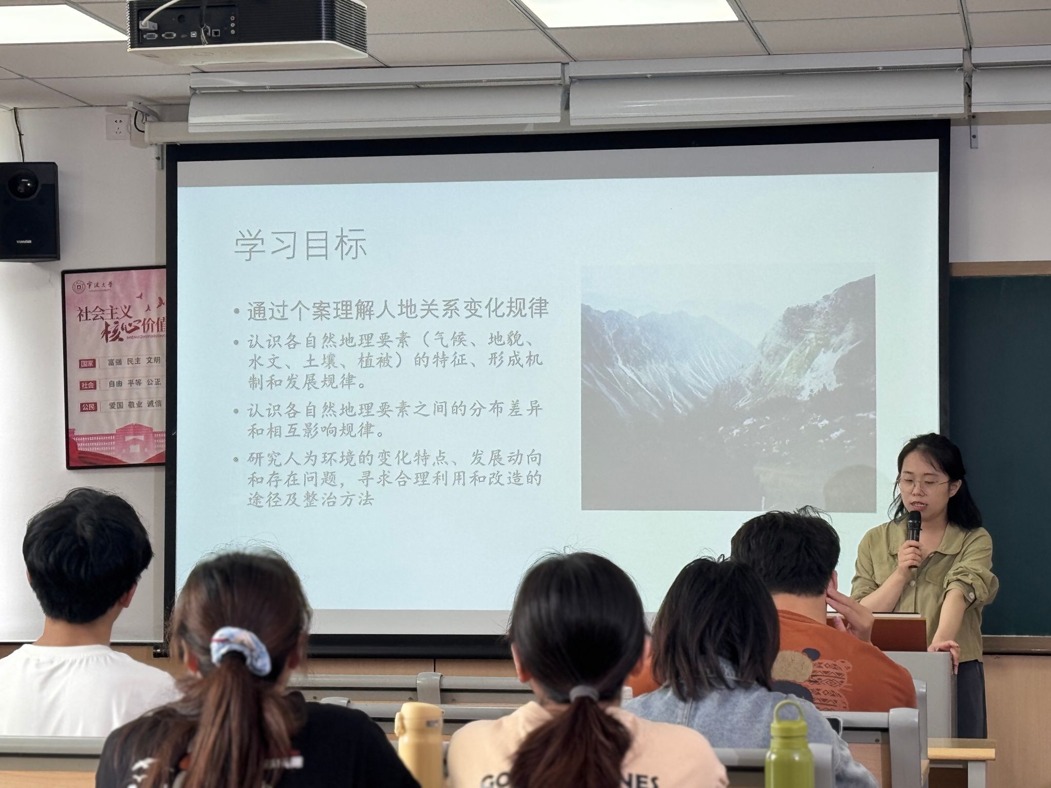 课堂上,张怡雯老师通过展示清晰的学习目标,引领学生踏上探索之旅。她引导学生借助具体个案,洞悉人地关系的变化规律,深度剖析各自然地理要素的特征、形成机制和发展规律。同时,鼓励学生探究人为环境的演变特点、发展趋势及现存问题,思索合理利用和改造的途径及整治方法。