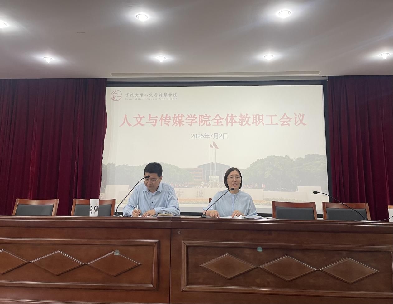 2025年7月2日,人文与传媒学院在包玉书科学楼10号楼209室召开全体教职工大会,会议由学院党委书记主持,学院党政班子全体成员及全体教职工参会。