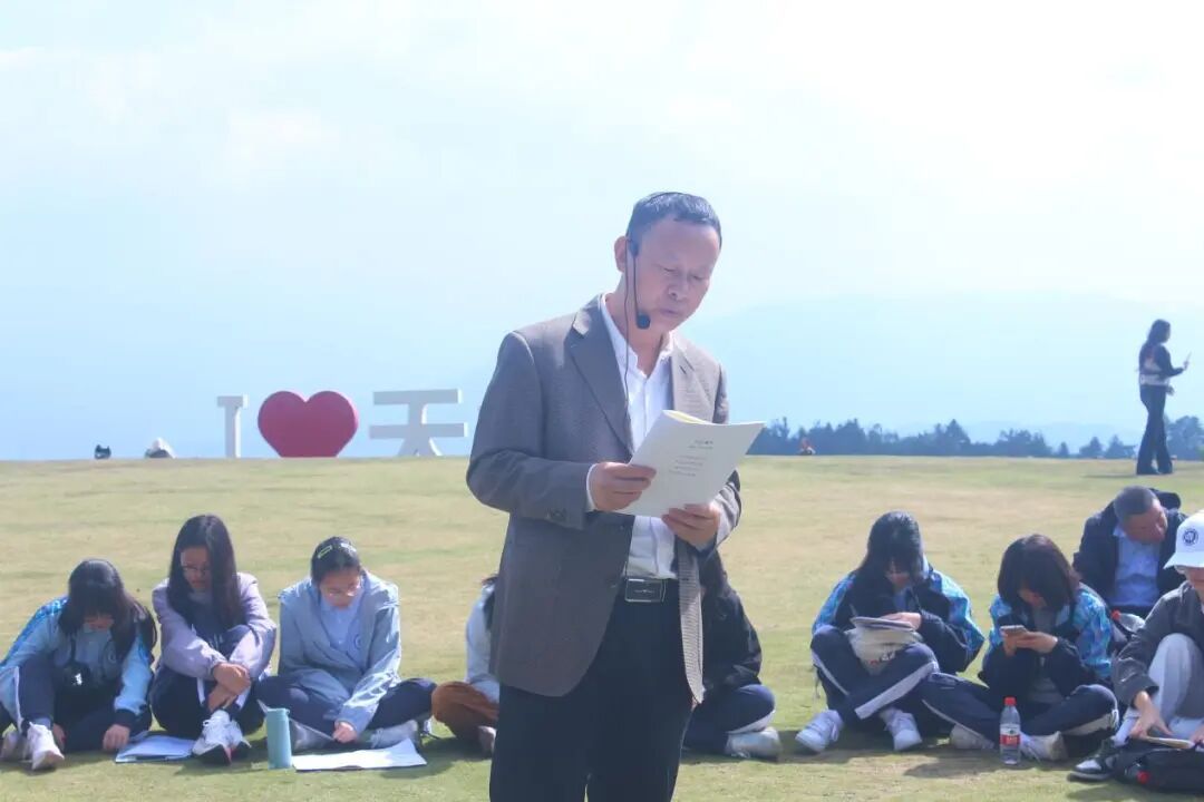 25日一早,师生们前往新昌天姥山。在山顶上,张如安教授带领大家学习传统吟诵技法。他先讲解了古汉语“平上去入”四声在吟诵中的特殊运用,并现场示范了《回乡偶书》的吟诵方式,随后带领全体同学一起体验吟诵的韵律之美。紧接着,沈浩杰副教授指导大家朗诵《梦游天姥吟留别》,从语气、停顿到情感起伏逐一拆解。最后,两名学生代表登台演绎,将学习成果精彩呈现。同学们感慨道:“站在天姥山顶朗读李白的这首诗,诗歌中的意象更加具象化,更能感受到他当年的豪情壮志,对这首诗的理解一下子立体了。”