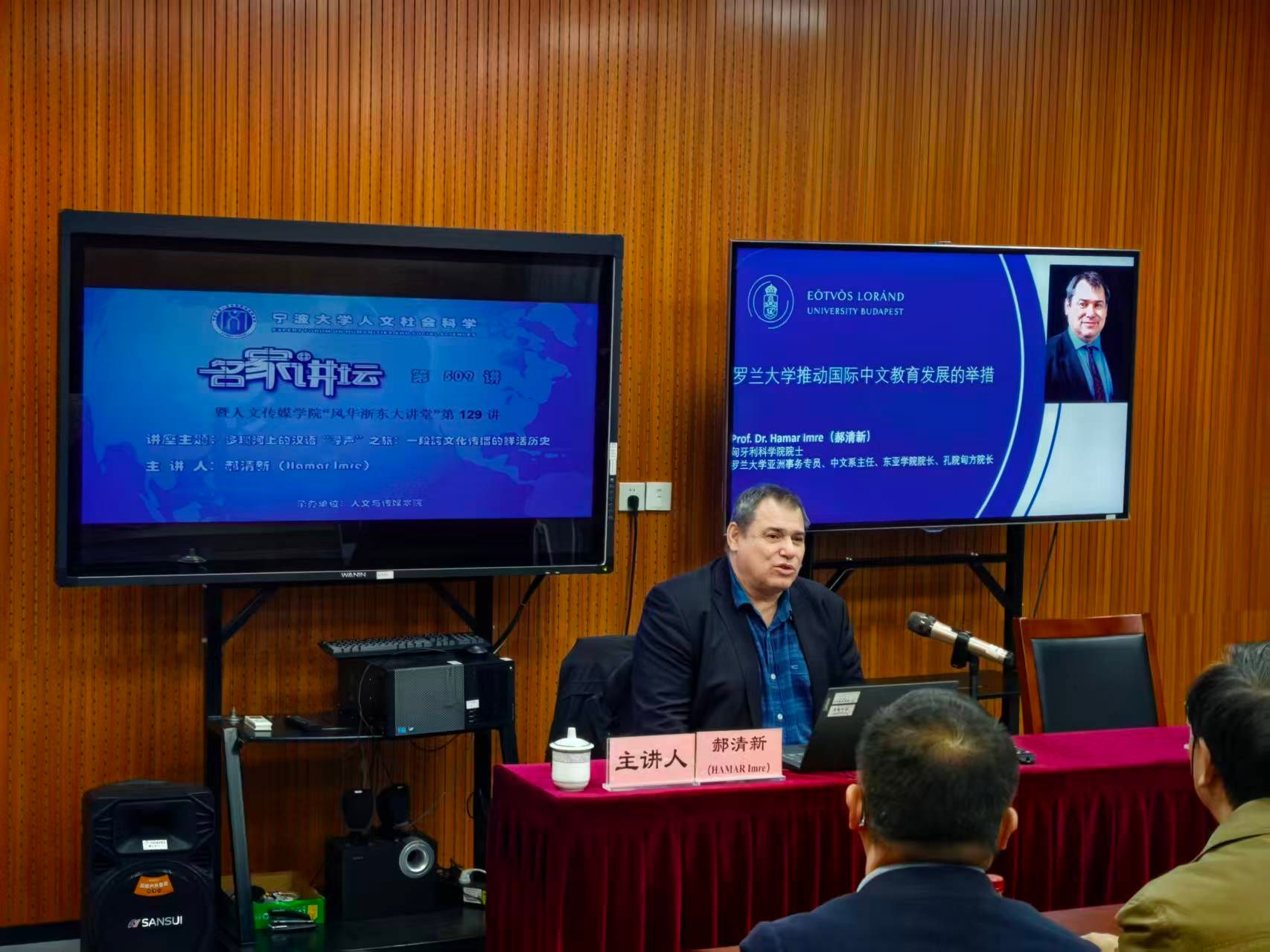11月19日,宁波大学“人文社会科学名家讲坛”第509讲暨人文与传媒学院“风华浙东大讲堂”第129讲举办。匈牙利科学院院士、罗兰大学副校长郝清新(Hamar Imre)应邀作了题为“多瑙河上的汉语‘寻声’之旅:一段跨文化传播的鲜活历史“的专题讲座。讲座由宁波大学副校长戴世勋主持。