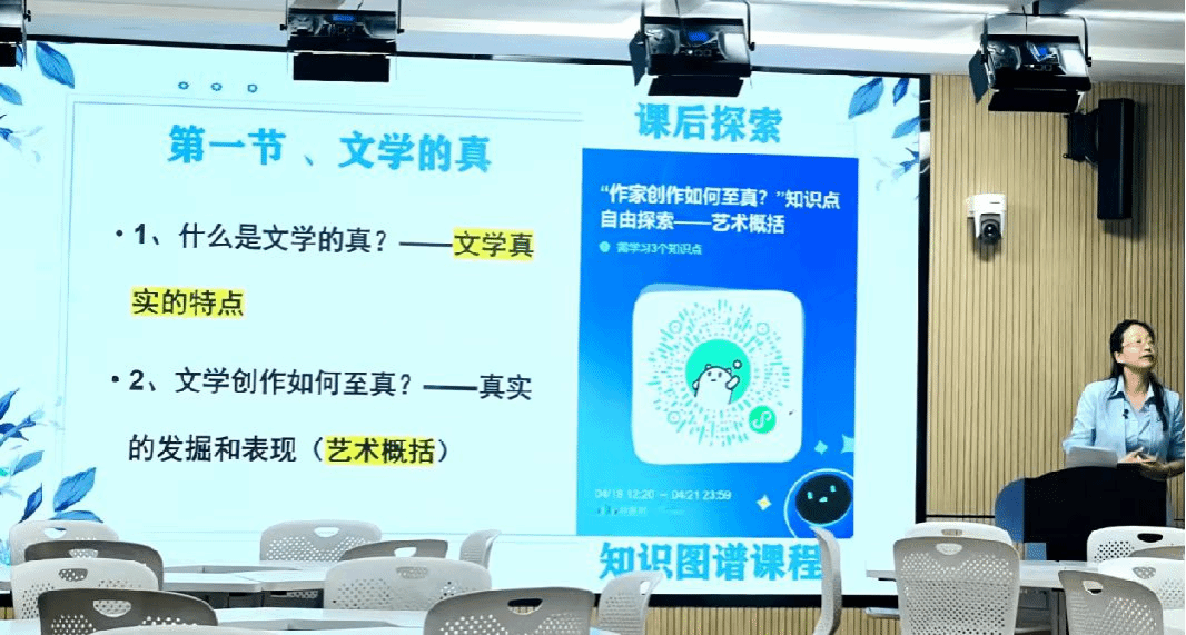 根据课程特点,胡泽球副教授充分发挥信息化教学手段,课前布置线上观看共享课视频、引导学生参与在线讨论,课中运用智慧树翻转课堂的线上抢答、投票、头脑风暴、在线测试等手段,结合大量的文学案例引导学生层层深入地探究一系列有关“文学的真善美”问题,让学生自主选择用话筒回答或是用语言文字在线发表看法,实现了线上线下师生的隔空实时互动,充分调动了学生们参与探究问题的积极性,课堂气氛活跃,师生交流轻松愉悦,学生参与度高,注意力集中,授课效果受到学生们的广泛欢迎和肯定。课后,胡老师引导学生通过知识图谱课程对自己感兴趣的延伸拓展知识进行自由探索。