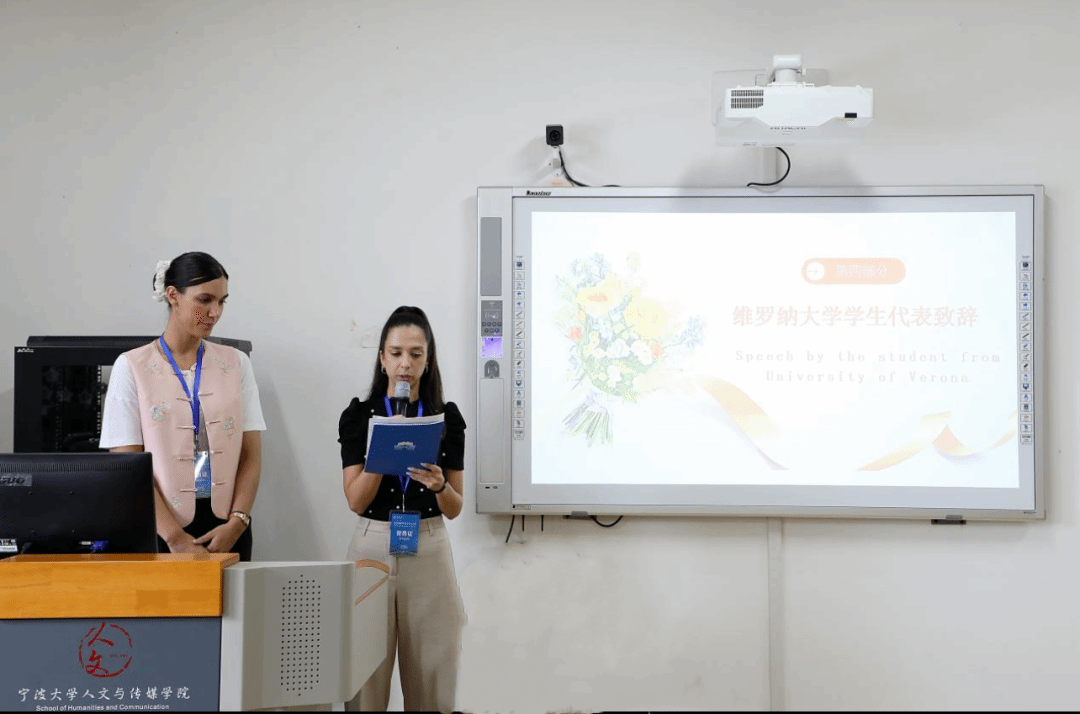 两位维罗纳大学的学生代表Nolè Carmen与Soardo Arianna也在会上发表了结营感想。她们用真挚的语言表达了对宁波大学师生的热情接待、对宁波自然风光的无限赞叹以及对深厚历史文化的深刻感悟,并对本次夏令营辛勤付出的学院领导、授课老师及志愿者们表示了衷心的感谢。