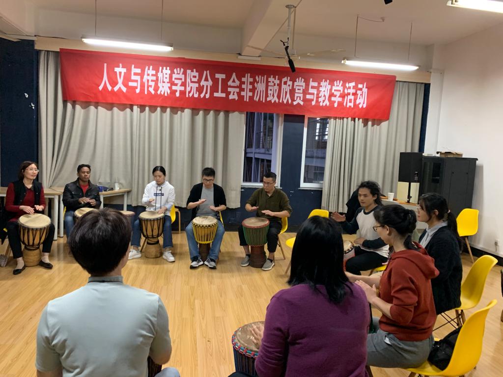 此外人文与传媒学院来自马达加斯加的三位留学生也来参与助兴,一场非洲鼓的欣赏与教学活动让老师们在笑声和鼓声里舒缓了疲惫、放松了精神,在笑声与鼓声中好像做了一场精神spa。同时,本活动也增强了师生感情,加强了国际间的文化交流。