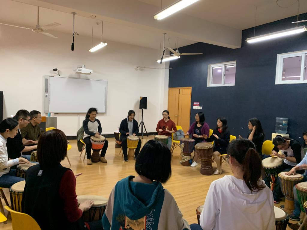 活动一开始,王大为老师先为大家演奏了一段,老师们立刻就被激昂欢快的鼓声感染了,纷纷忍不住一试身手。王老师教了大家最基本的低、中、高三个音,又教了几种简单节奏,并让大家一起来演奏。老师们边用手敲击、边用脑回忆,逐渐整齐划一的鼓声让老师们感受到了一种张扬挥洒的快乐。