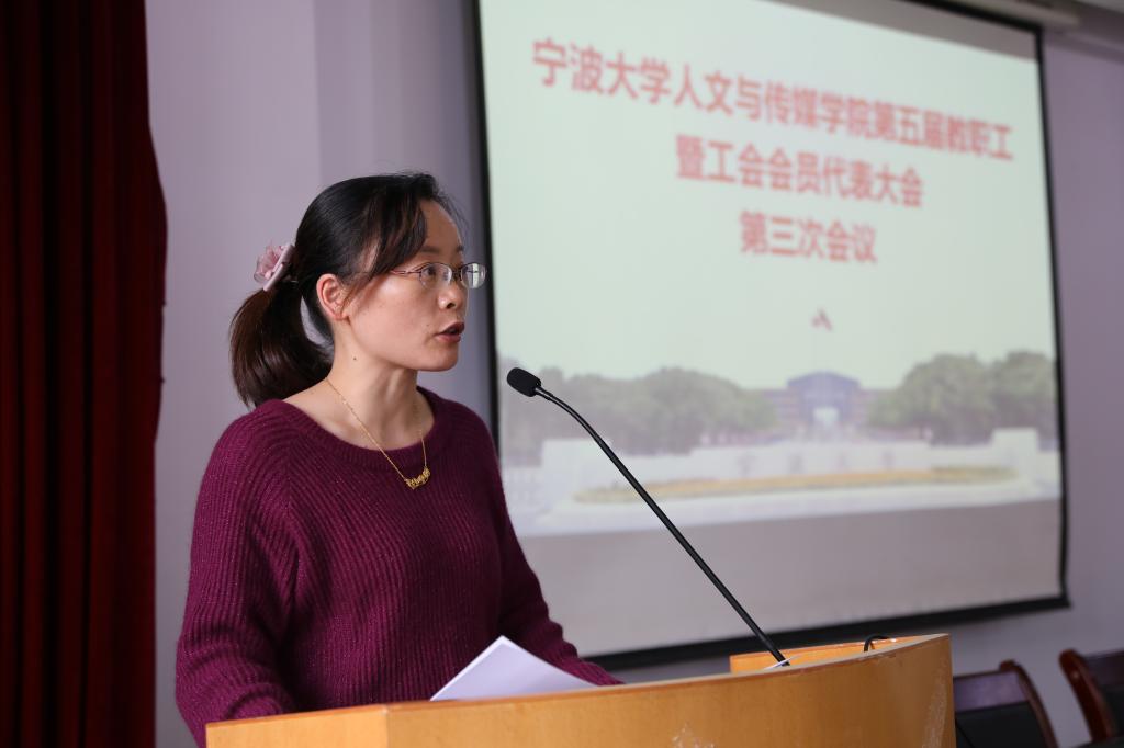 10月27日下午,人文与传媒学院在10#209报告厅召开了第五届教职工暨工会会员代表大会第三次会议。会议由学院党委书记张佩芬主持,39名代表参加。