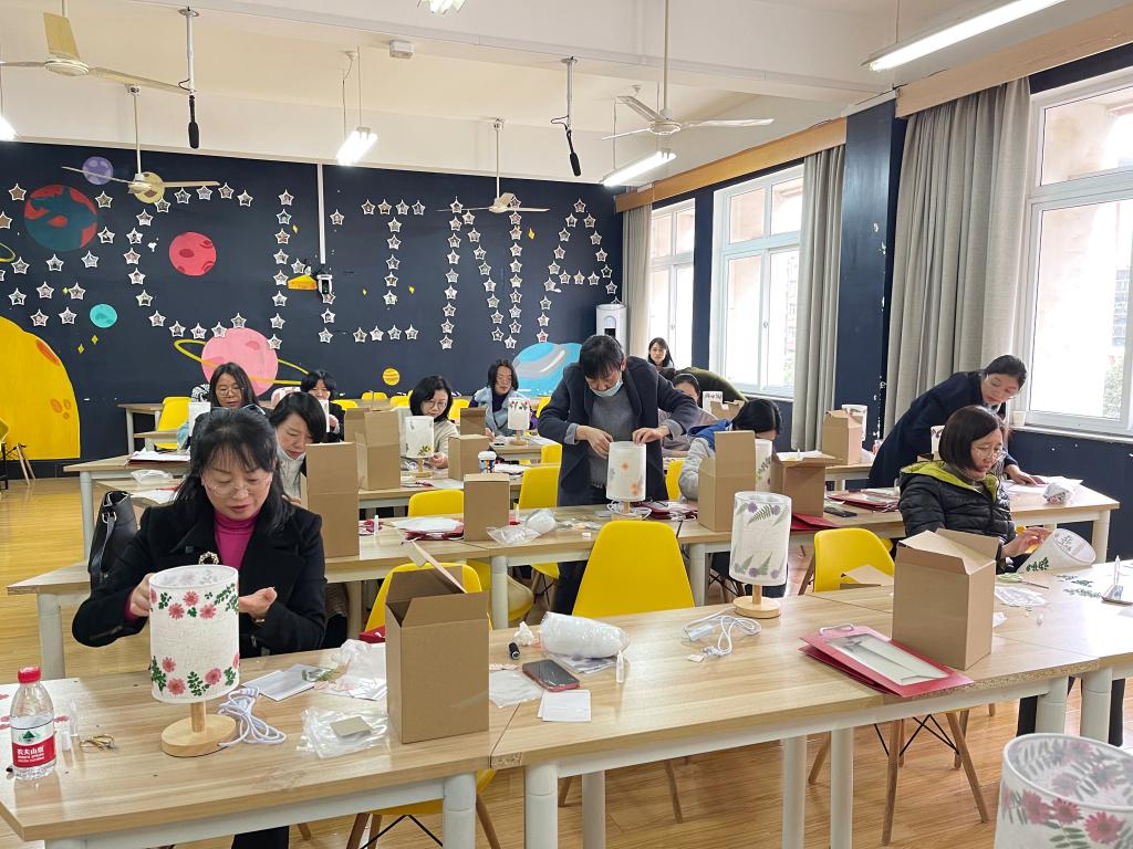 在活动现场,指导老师用生动幽默的语言向学员们介绍台灯压花技巧,鼓励大家大胆使用手中的花花草草进行搭配创新。重新搭配后的花朵与树叶在学员们的手中变得异常美丽,花灯吐艳,淡雅唯美。看着自己亲手制作的台灯,每个人的脸上都洋溢着笑容,非常有成就感。