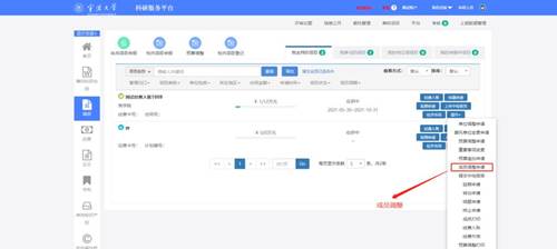 4. 进入项目组成员,请确认成员是否完整。特别是项目中有学生的参与的,请完善学生身份类别。成员信息有问题的,进入科研系统文轩探花,左侧的项目界面,点击操作下拉框下的成员调整申请,进入成员调整界面进行添加和修改,待项目主管审核之后,会自动补充到项目经费公开一览表,最后再提交即可。