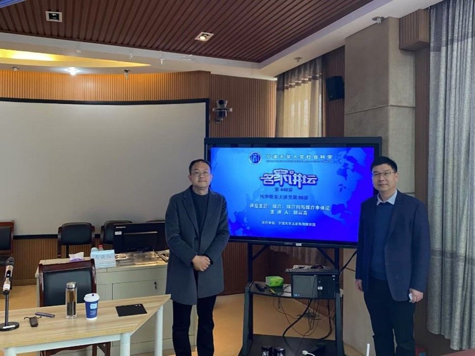 12月14日南京大学新闻传播学院教授胡翼青应邀来到宁波大学,为广大师生带来了一场以“媒介、媒介物与媒介本体论”为主题的学术讲座。讲座吸引了宁波大学新闻传播学院众多师生,以及对媒介研究感兴趣的学术同仁前来聆听。