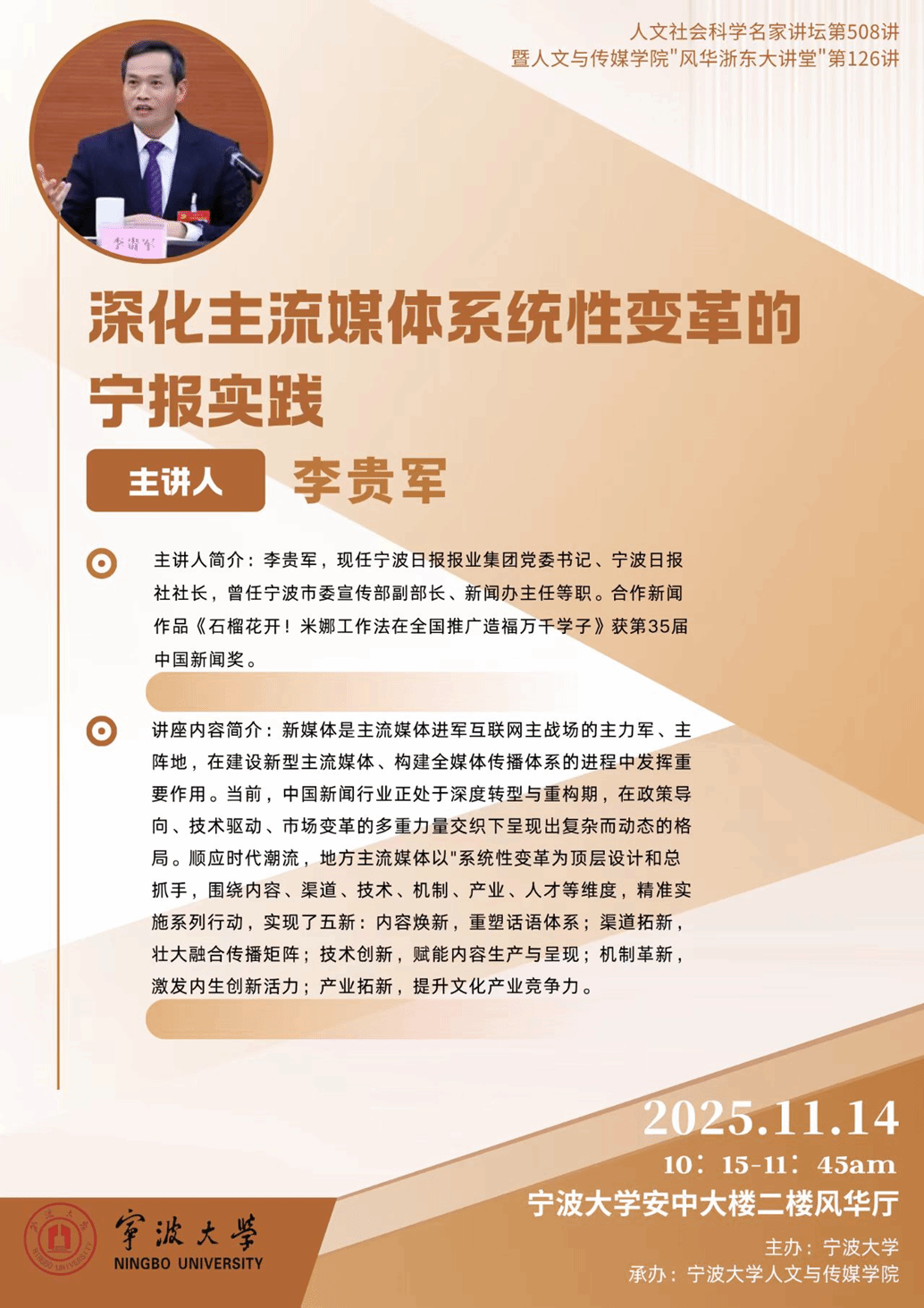 主讲人简介:李贵军,宁波日报报业集团党委书记、宁波日报社社长,曾任宁波市委宣传部副部长、新闻办主任等职。合作新闻作品《石榴花开!米娜工作法在全国推广造福万千学子》获第35届中国新闻奖。