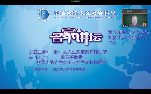 2022年5月24日下午,中国人民大学杰出人文学者特聘教授袁济喜先生应邀做客宁波大学人文与传媒学院,为我校师生作了题为“默:从人生态度到审美心智”的线上学术讲座。讲座由我院程景牧博士主持。