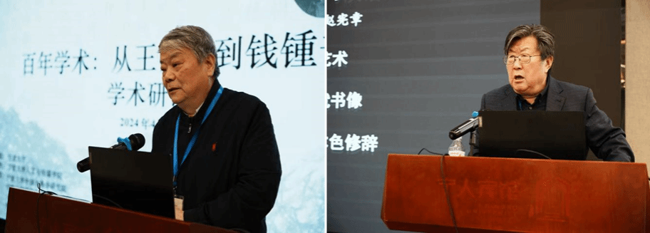 大会的主题报告环节,由《探索与争鸣》屠毅力博士主持,共有八位专家学者先后发言。上海交通大学夏中义教授围绕“从古籍到今典的版本学”,对《中国诗与中国画》“修订”本、《管锥编》“增订”本、《宋诗选注》“拟残”本进行心因解码,从而探讨钱著版本的演化问题。南京大学赵宪章教授则从“书写艺术非摹仿”“语象被比象成就书像”“文学书像论新场域”三方面,指出文学书像不同于画像等一般文学图像,并不是对物的直接摹仿,而是一种特别的书写比象。
