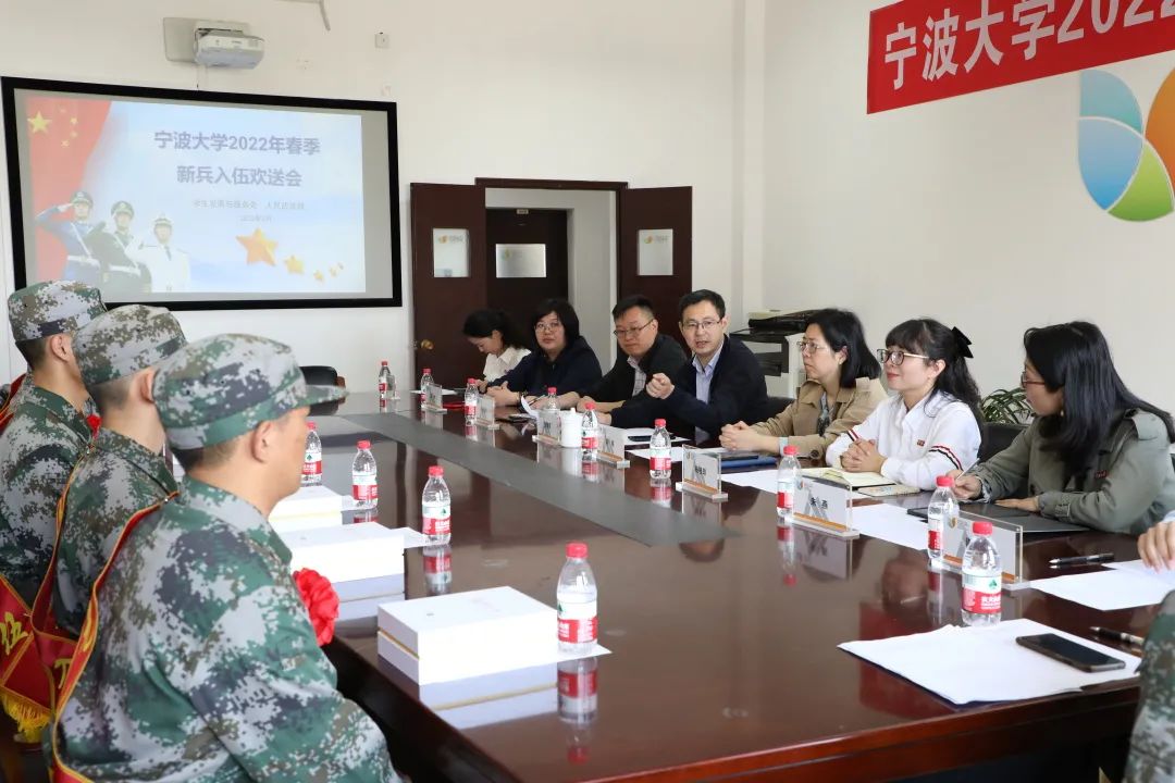 3月14日上午,宁波大学2022年春季新兵入伍欢送会在黄庆苗楼406会议室举办,校党委副书记童晓晖、校人民武装部负责人、相关学院副书记,征兵工作辅导员,军辉战友团老兵代表以及8名应征入伍学生参加。