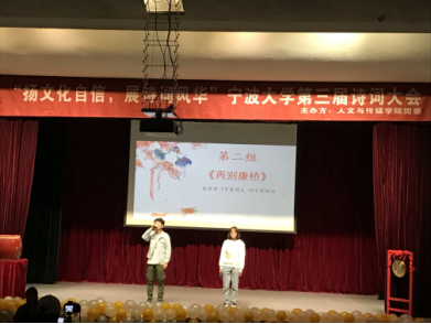 本届诗词大会分初赛、复赛与决赛三个阶段,有百余名选手报名参加。经过初赛、复赛,最终产生10名选手晋级决赛,本届诗词大会决赛前,得到来自八行文化陈列馆馆长史云彪先生的大力支持,并以书画的形式对本届诗词大会题词“宁波大学诗词大会”,而《如果能重来,我要选李白》配音节目拉开了本届诗词大会的序幕,本届诗词大会由四个环节组成,第一环节由10位选手分成了5组,用朗诵诗词等方式展现小组才艺,第二环节通过选手依次答题来获得本环节积分,第三环节选手比速度进行答题最终有3位选手进入第四环节、本环节3位选手通过九宫格里相连的字准确说出诗句,并根据说出诗句多少来决定冠亚季军。最后,人文与传媒学院党委副书记为本届诗词大会冠亚季军颁奖。