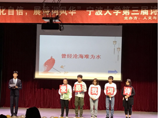 2018年11月4日晚18:00人文与传媒学院在锦绣小剧场顺利举办了“扬文化自信,展诗词风华”宁波大学第三届诗词大会。人文与传媒学院党委副书记骆明伟老师、中文系田启涛老师、周景耀老师以及学工办全体老师与来自各学院的同学们一起观看了本届诗词大会,最终来自阳明学院师范类文科班的张璐瑶同学荣获冠军、法学院潘西同学荣获亚军、阳明学院李岳儒同学荣获季军.