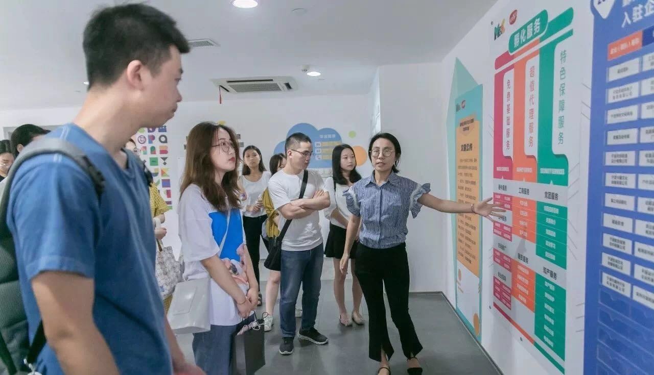宁波国家广告产业园于2017年4月被国家工商总局正式授牌认定为“国家广告产业园”。现有8幢专业楼宇、7个基础性公共服务平台,已有700多家与广告相关的公司入驻。园区目前拥有数据互联网、广告创意设计、影视剧制作三大支柱产业,在走访过程中代表团有幸参观了园区展厅、书吧、青年文创空间等公共服务平台,以及玖策公关策划有限公司与梵一标识有限公司。