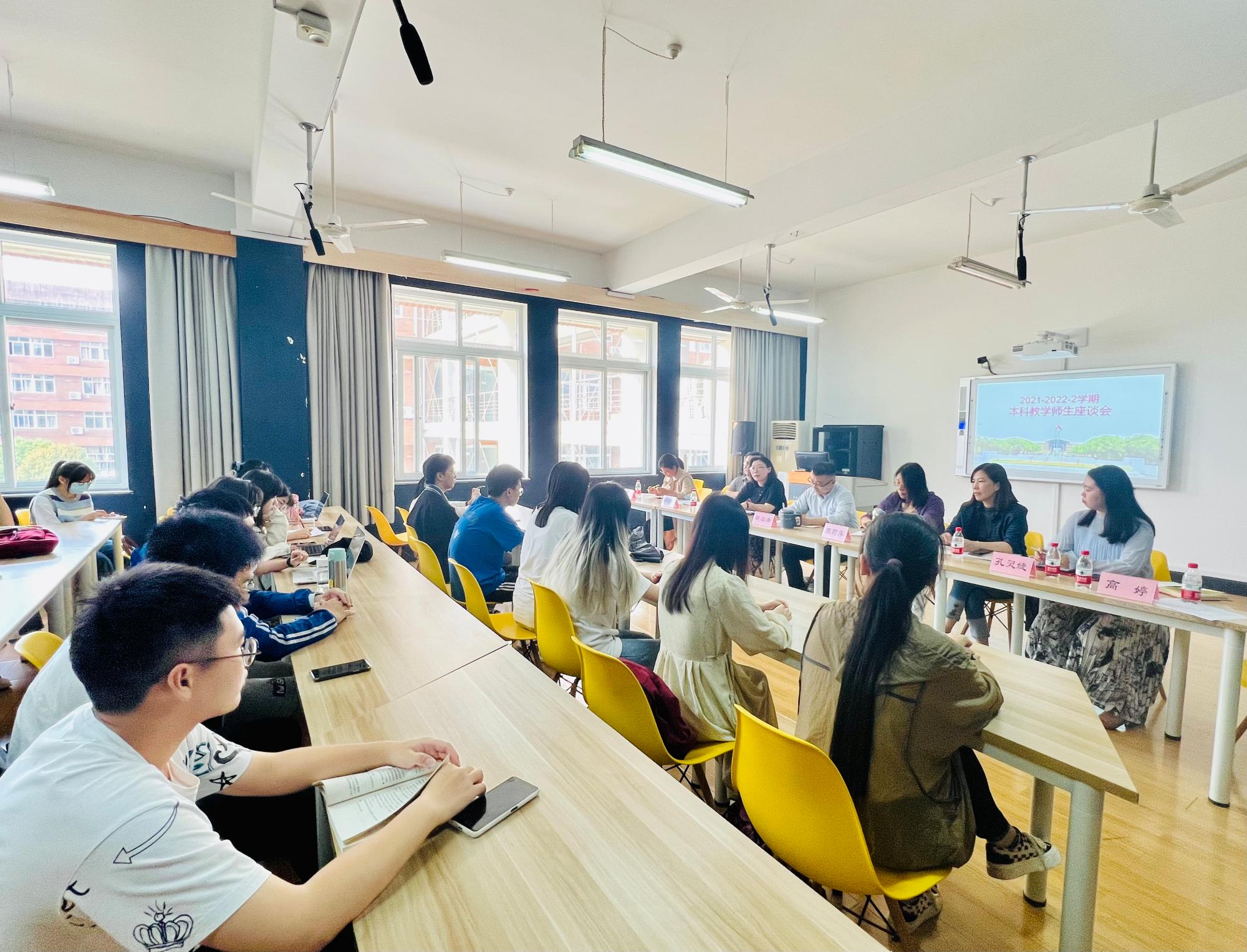 为进一步提升本科教学质量,稳步推进学风建设, 5月25日下午,人文与传媒学院在10-208召开2021-2022-2学期本科教学工作师生座谈会。学院党委委员田启涛老师、学院教育督导委员会主任周莉萍老师、学院督导徐琼老师、杜娅林老师,中文系系副主任周景耀老师、新闻传播系邵慧老师、教务办三位老师以及2019、2020级、2021级各班学生代表参加了此次座谈会。