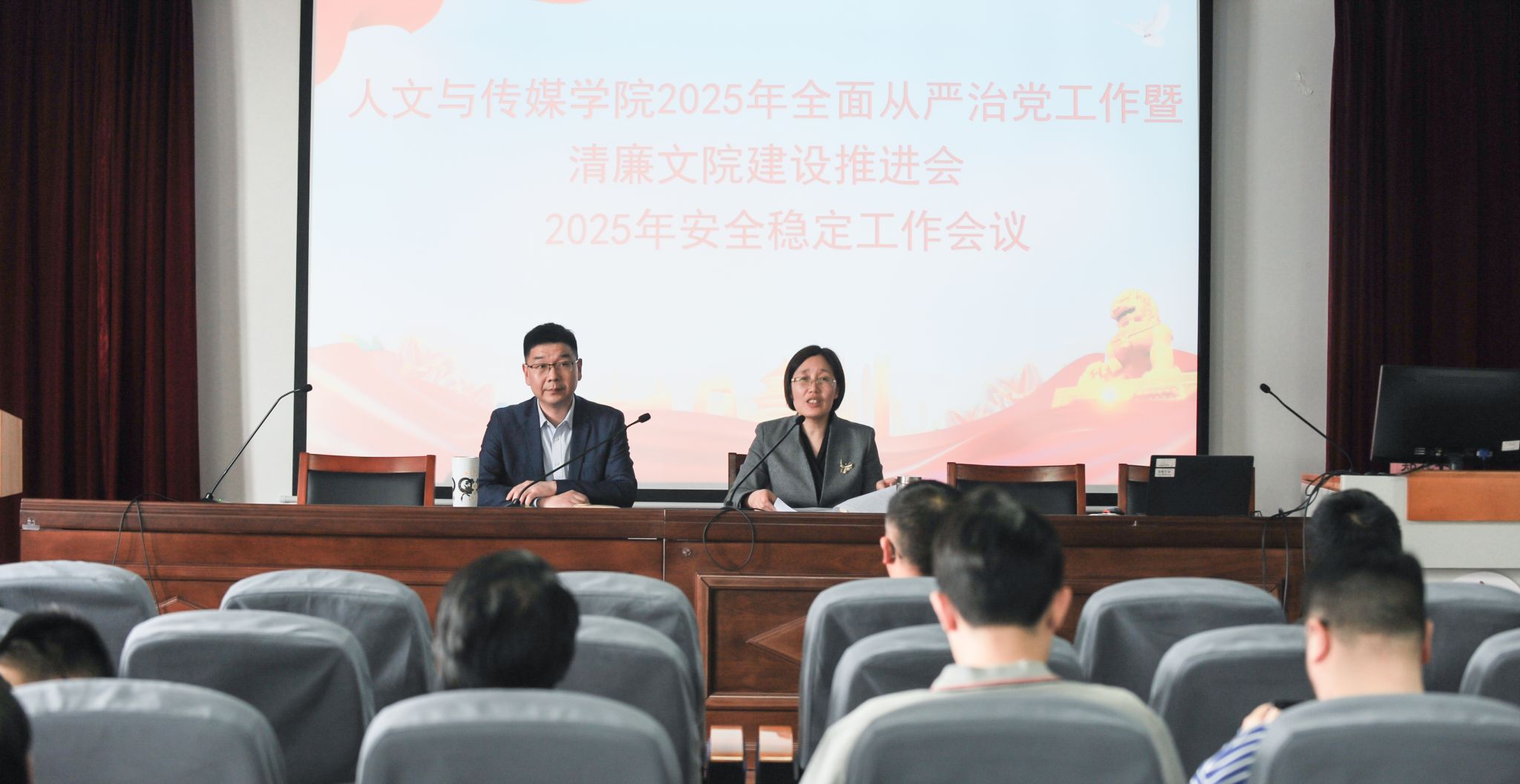 4月9日,人文与传媒学院召开2025年全面从严治党暨清廉文院建设推进会、2025年安全稳定工作会议。学院党政领导班子成员及全体教职工参加会议。