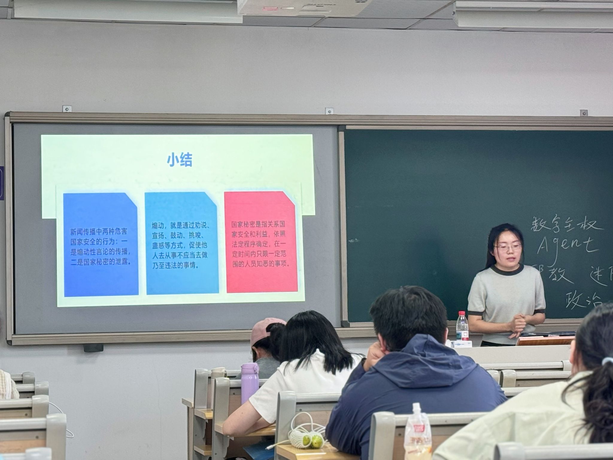 本次课程以“新闻传播内容的法律底线”为核心。贾牧笛老师摒弃理论堆砌的讲授方式,通过多则贴合行业实际的鲜活案例,将新闻传播与“维护国家安全、荣誉与利益”、“维护社会秩序与公序良俗”的深层关联具象化呈现。在案例剖析中,既夯实了学生对传播法规的专业认知,又引导其树立正确的行业伦理观,实现专业知识传授与价值观念引领的有机融合。