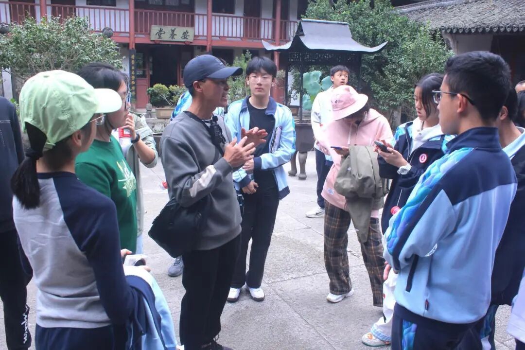下午,队伍转赴天台山国清寺。这座始建于隋代的千年古刹,是唐诗之路上的重要文化地标。同学们分组在专业讲解员的带领下参观隋塔、隋梅、寒拾亭等古迹,了解国清寺历史及其在文人笔下的形象,体会诗人如何以古迹入诗。