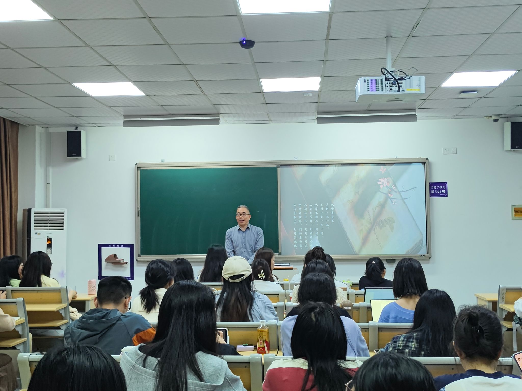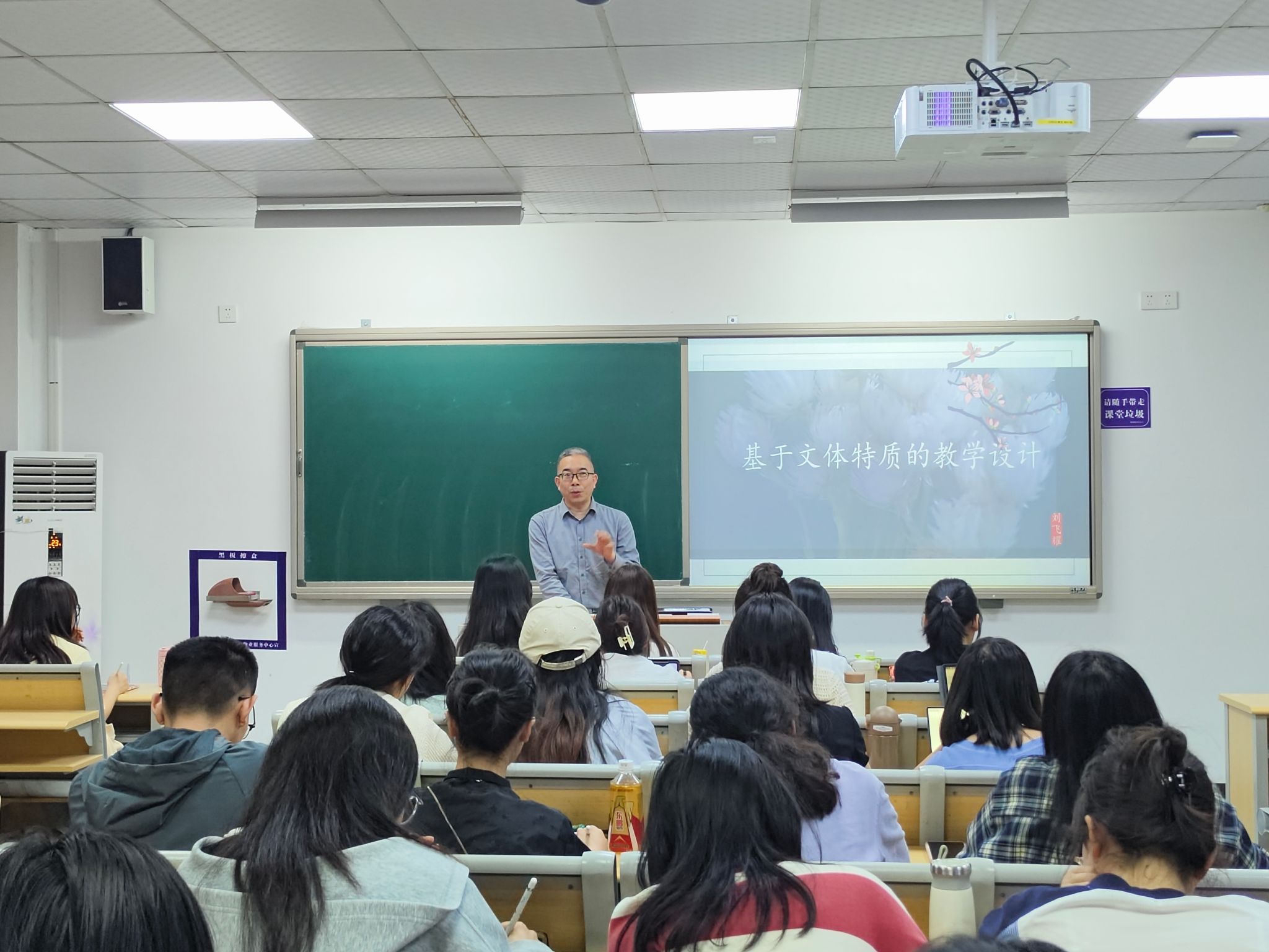 讲座过程中,刘老师援引《文学散步》《汉字的魔方》《小说面面观》等著作,结合《江雪》、《记承天寺夜游》、《散步》、《藤野先生》等优秀范例,向同学们传授经验,由表及里,生动幽默,深入浅出。参与讲座的同学们踊跃发言,对话名师,意识到学习之路漫漫,无论在文学素养还是在教学技能上,都需精进自己,不辍努力!