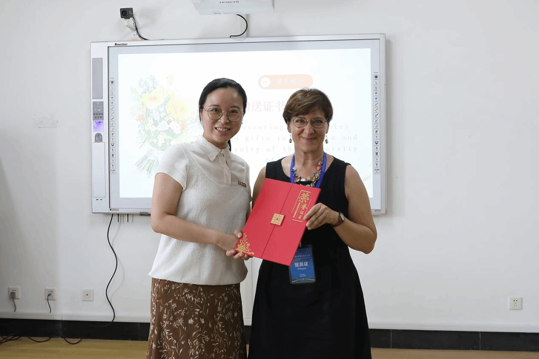 宁波大学国际处处长周洵瑛为维罗纳大学来访师生颁发了证书,以表彰他们在夏令营中的出色表现。而李乐院长则代表学院向维罗纳大学师生赠送了精心准备的伴手礼,寓意着两校之间的深厚情谊。